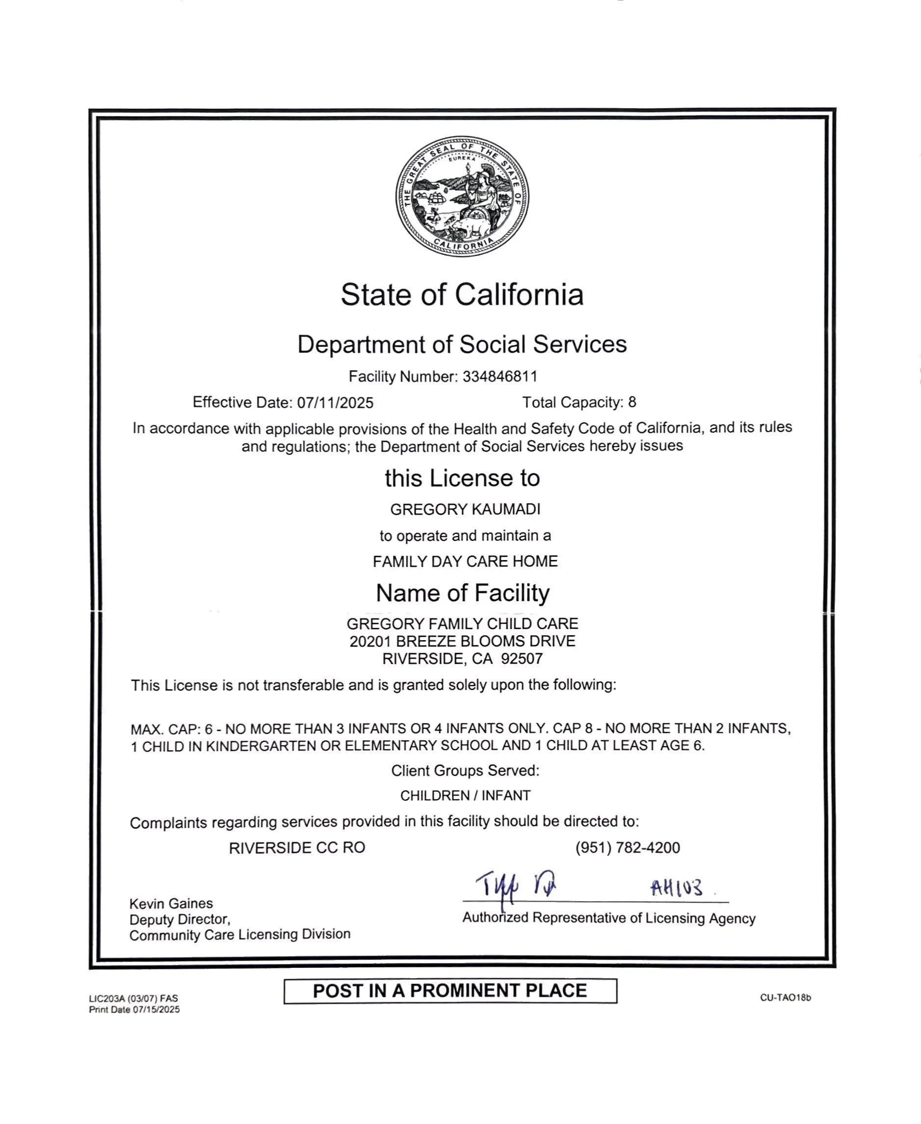 We are licensed by State of California, Department of Social Services.